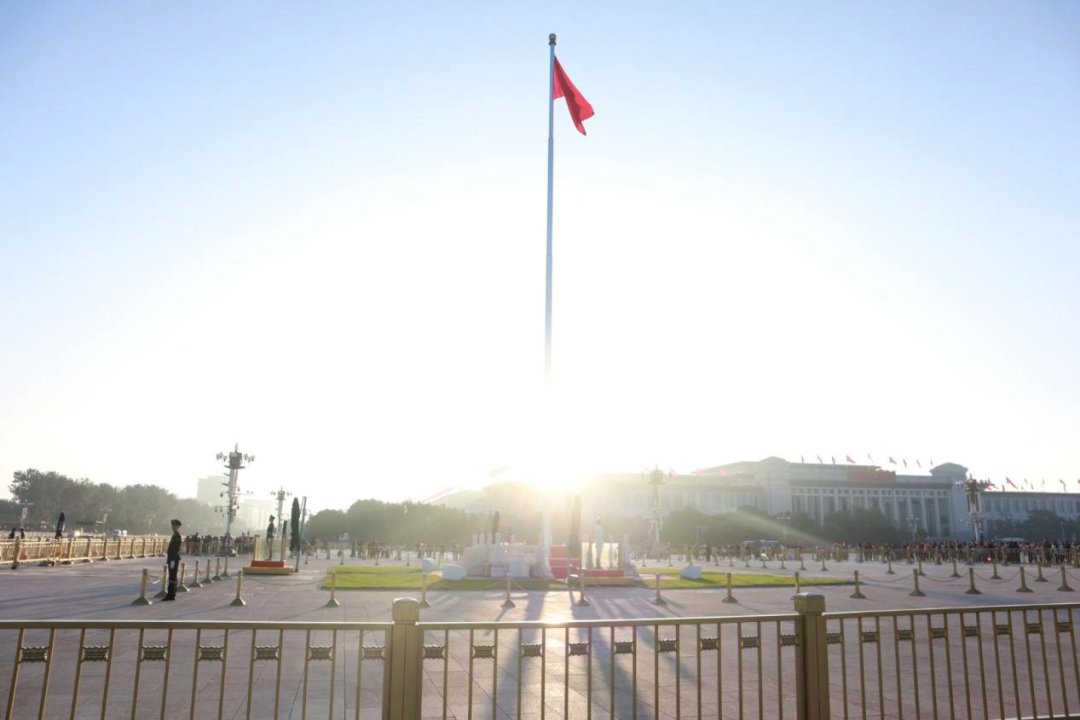 2024年10月7日清晨,燕京学堂来自世界各地的五十多位同学们满怀期待地前往天安门广场,见证五星红旗的庄严升起。北京的清晨,空气中弥漫着清新的凉意,而天安门广场上早已人声鼎沸,不同面孔的人们汇聚于此,共同期待这庄严时刻的到来。随着升旗仪式的开始,解放军军乐团礼号手的号角声在广场上空回荡,三军仪仗队迈着整齐的步伐,护送五星红旗走向旗杆。在雄壮的国歌声中,五星红旗缓缓升起,迎风飘扬。这一刻,中国同学自发齐唱国歌,歌声与国旗一同飘扬在广场上空,现场气氛庄重而热烈。