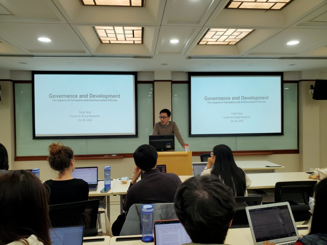 10月28日,北京大学光华管理学院副教授於嘉在其讲授的“中国社会”课程中,邀请了光华管理学院助理教授杨锋进行题为“治理与发展: 腐败与反腐败政策的影响”(Governance and Development: The Impacts of Corruption and Anti-Corruption Policies)的讲座。在本次讲座中,杨锋老师探讨了治理与发展的核心议题,重点聚焦于腐败问题及廉政建设。讲座系统梳理了理解腐败决定因素的主要理论框架,并向同学们介绍如何通过跨国数据和实验数据进行实证分析,估计相关因素的实际影响。