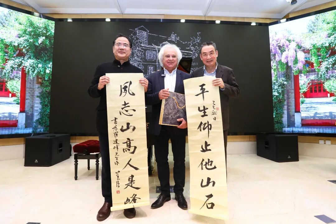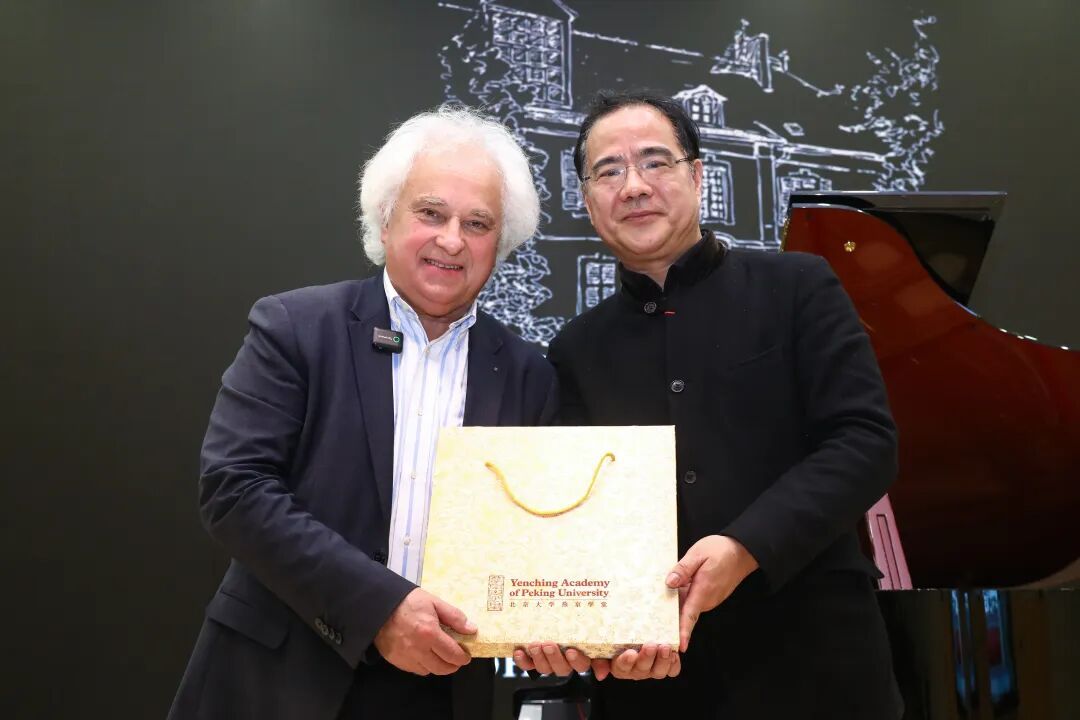 活动尾声,董强院长代表学堂向亨利教授赠送礼物。值得一提的是,亨利教授当日弹奏的普雷耶钢琴,其捐赠者普雷耶钢琴(上海)有限公司总经理罗建峰也亲临现场。董院长特别向罗先生致谢,并赠送亲笔题写的楹联 “平生仰止他山石,夙志山高人是峰”,以此致敬他的热忱付出。正是得益于罗先生及其团队的努力,拥有两个世纪工艺传承的普雷耶钢琴得以焕发新生,更成为燕京学堂学子感受音乐魅力的重要媒介。