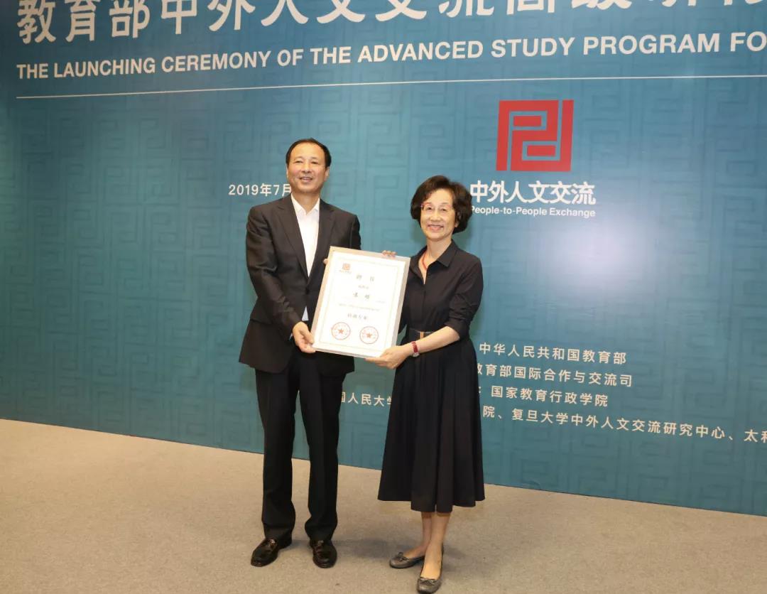 2019年7月8日下午,教育部“中外人文交流高级研修计划”启动仪式在京举行,北京大学燕京学堂院长袁明受邀出席。启动仪式上,教育部党组成员、副部长孙尧为袁明院长颁发了“中外人文交流高级研修计划”特邀专家聘书。