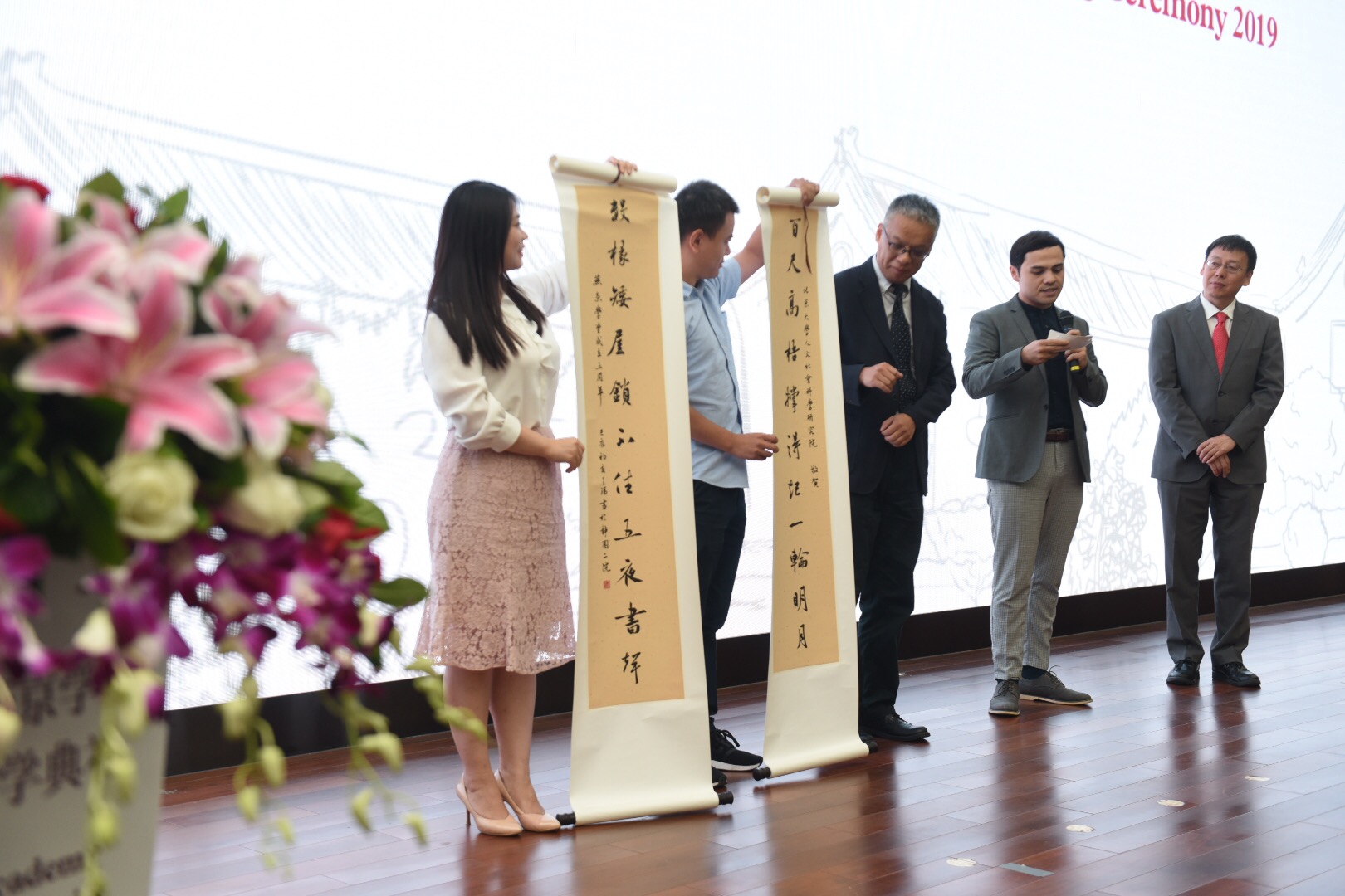 这是北京大学燕京学堂2019年开学典礼上,来自静园二院的北大人文社科研究院赠送给静园三院的燕京学堂的对联。一墙之隔的兄弟友邻自成立以来,互相扶持,情真意切,在推动北大国际化的道路上共建静园文化。