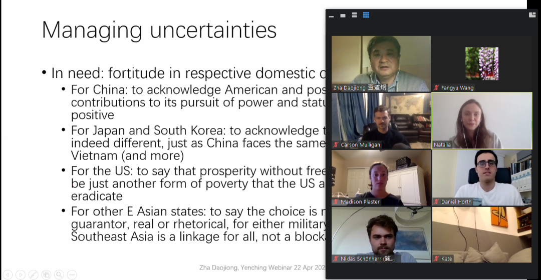 最后,査教授针对未来中美关系的不确定性,提出了自己的看法。他指出,所谓的其他国家需要在中国和美国之间做出选择、寻求保护的话语建构是有问题的,亚洲其他的国家能够掌握自己的命运。包括中美在内的各国在话语上都要有所克制,尊重事实。