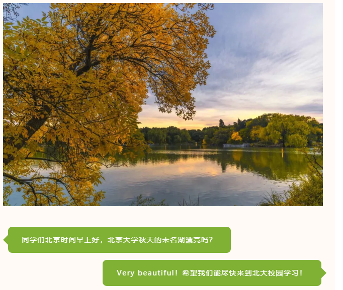 为了让同学们有更好的线上学习体验,老师们根据班级特点采取多样方式开展教学与互动。林欢老师经常会拍一些北大校园美景发给同学们,让同学们在学习汉语的同时也能感受到北大、北京的美丽,激发大家学习的热情。陈莉老师在中秋节到来时跟同学们讲述中秋节的传统,还在微信群里请大家“吃月饼”。