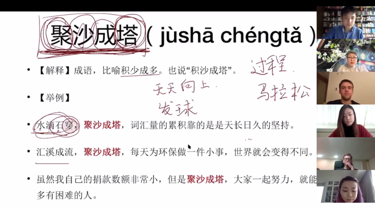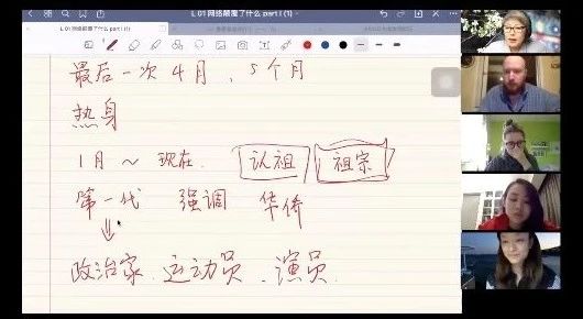 汉语课5班的陈莉老师表示:“和所有燕京学堂的中文课班级一样,5班的同学在中文网课上不是欢聚一堂,而是“欢聚两堂”,因为时差,周二和周五各有几位同学上直播课,怎么样才能把周二和周五的同学连接起来让大家有同属“一个班”的感觉呢?