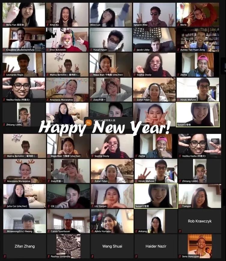 2020年12月30日,在研究生会组织的新年晚会上,身处世界各地的同学们在云端相聚,共同欣赏本次微视频大赛中的优秀作品,讲述过去的一年里各自不同的生活与感悟,用形式多样的节目表达自己对学堂老师和同学们的新年祝福。