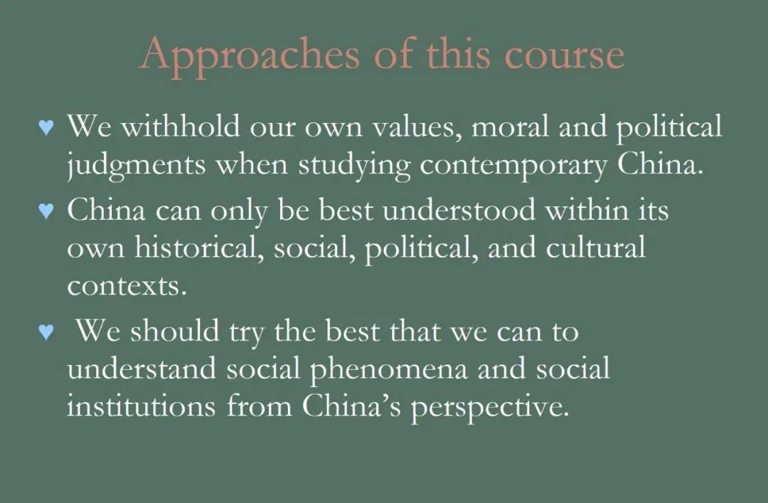 在第一堂课上,於嘉老师介绍了这门课的授课理念:“在研究当代中国时,我们应该暂时搁置自己的价值观、道德和政治判断。只有在中国自身的历史、社会、政治和文化背景下,我们才能更好地理解中国。” 基于於嘉老师所倡导的这种开放、中立的治学态度,营造了严谨自由的课堂氛围,学生们在课堂中自由表达、热烈讨论,收获颇丰。