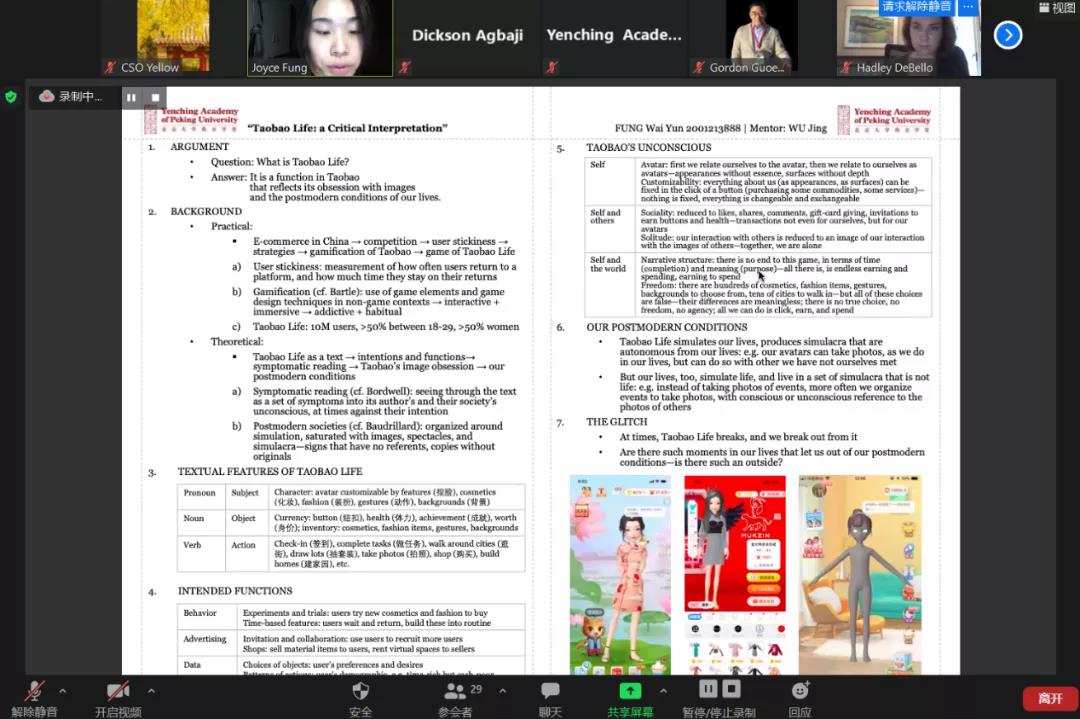 2020-2021学年春季学期,课程模式由第一学期的讲座和小组讨论转变为老师指导下的小组调研。受新冠疫情情影响,61名留学生无法抵达燕园,课程仍然以线上教学的形式呈现。为了不因空间的距离影响沟通交流的深度,14位课程指导教师在非常情况下,鼓励学生探索灵活研究方法的同时,辅以专业文献、方法论和批判性思维等方面的指导,与本组学生定期进行线上研究指导。