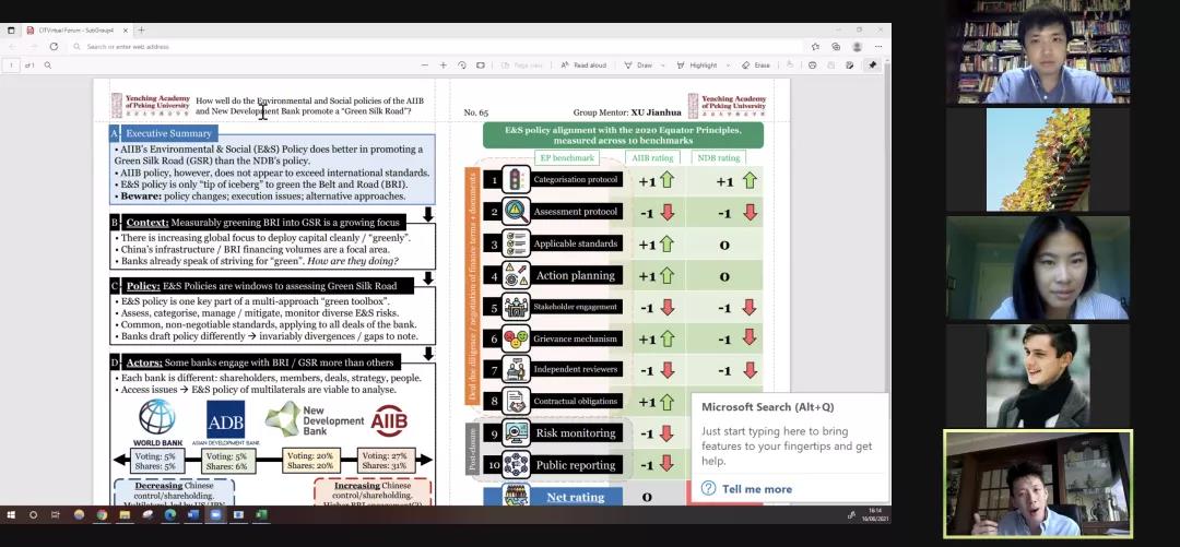 在环境和经济论坛相似的研究议题中,方法论与结论的殊途同归,拓展了同学们的思路。在环境治理的过程中,经济手段扮演了重要的角色。因此,环境领域小组的同学们讨论了国际性金融机构对绿色一带一路相关问题的态度,并以新开发银行与亚洲基础设施投资银行为例,以赤道原则为标准,分析了两家国际金融机构发布的环境相关的政策。经济组的同学采用主成分分析法,对中国各地进行绿色经济体系评价,比较各地区绿色经济的发展,帮助实现更有针对性的监督和指导。
