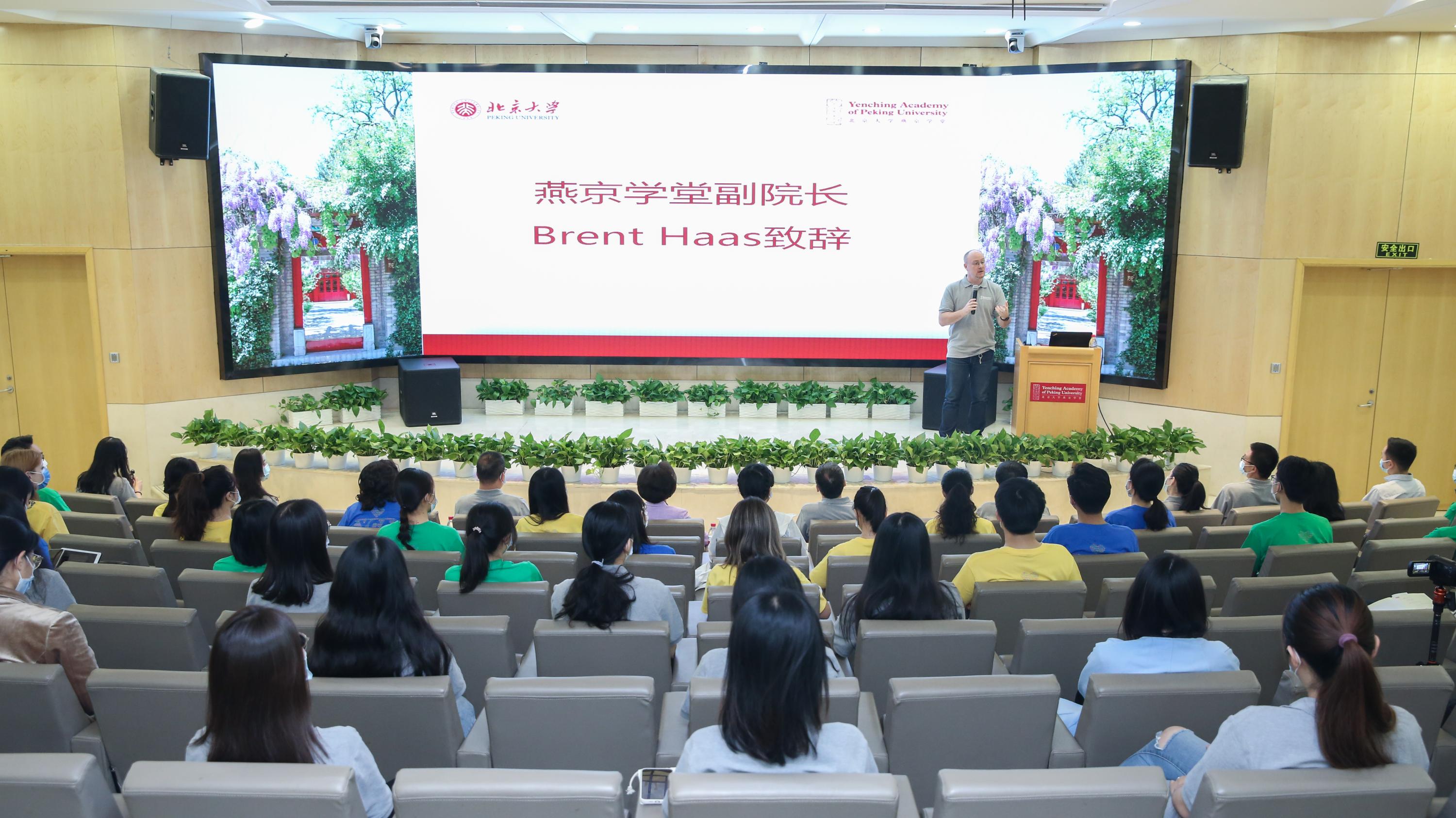副院长Brent Haas主持活动并致辞,他对同学们提出三点建议:第一,找到“大”“小”之间的平衡,同学们站在高处代表自己国家的同时,更应该在细微处代表自己,将自己的文化背景与新环境的体验相结合,展示出真实的自我;第二,兼顾好学业与社交生活,积极探索城市角落和新鲜事物;第三,肩负起责任,做燕京学堂的“大使”,将校园动态“云中”传递给未能到校的同学们。