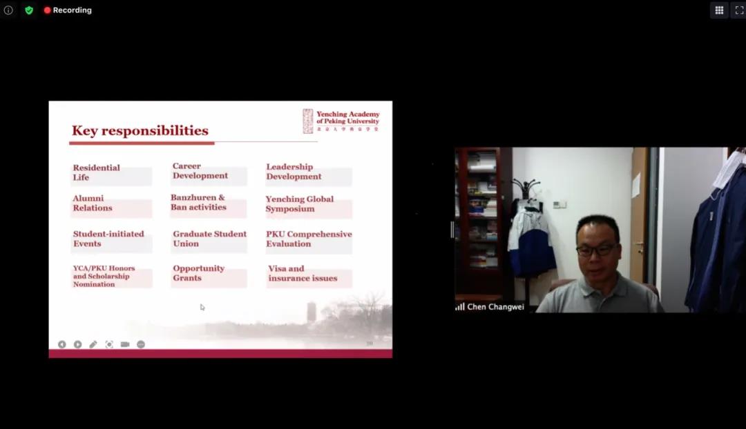 最后,院长助理陈长伟讲解了燕京学堂主要的规章制度,介绍了学生工作团队和学生活动。