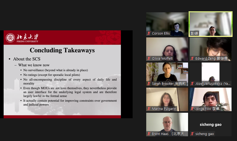 2022年6月16日上午,北京大学法学院助理教授、院长助理彭錞为北京大学燕京学堂的师生带来了题为“理解中国的社会信用体系”(Understanding China’s Social Credit System)的线上讲座。本次讲座是燕京学堂2021-2022学年必修课“中国专题系列讲座”的第十讲,由燕京学堂副院长Brent Haas主持。彭錞老师从评价中国社会信用体系的常规视角说开,在阐释概念内涵的同时,也回溯了中国社会信用体系的起源和过去二十年里的发展轨迹,并结合失信联合惩戒这一重要制度以检视其合法性。