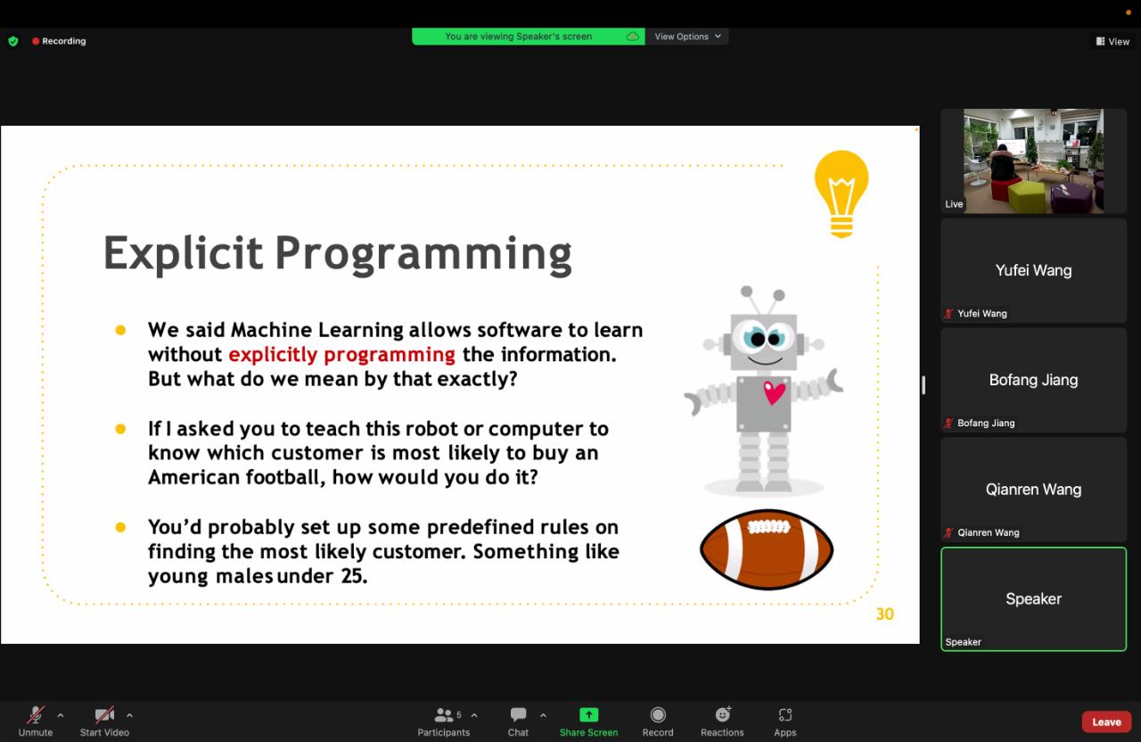 本次活动的主讲人为北京大学计算机学院博士生王炫之。她从机器学习引入,以Matlab、Python等数据工具为案例,向社科方向的同学们分享了现代人工智能和机器学习方面的相关知识,以及数据分析工具的入门攻略。