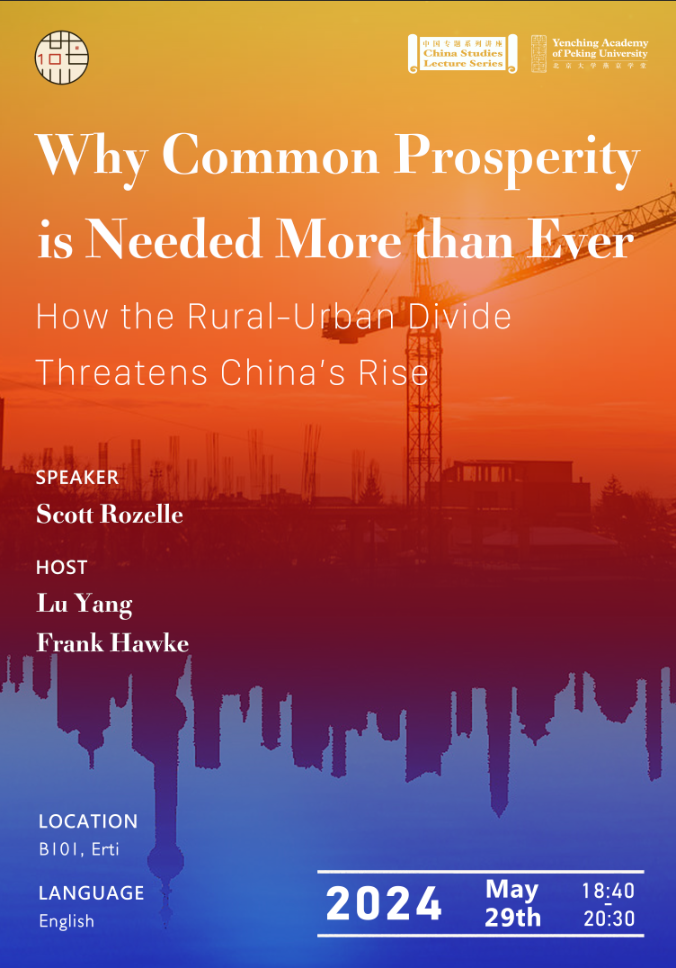2024年5月29日,斯坦福大学FSI国际所亚太研究中心教授、高级研究员,斯坦福大学中国经济和制度研究中心的联合主任Scott Rozelle(罗斯高)为北京大学燕京学堂的同学们带来了题为“共同富裕的紧要性:城乡差距对中国崛起的挑战”(Why Common Prosperity is Needed More than Ever: How the Rural-Urban Divide Threatens China’s Rise)的讲座。本次讲座为燕京学堂2023—2024年必修课“中国专题系列讲座”的第十一讲,由燕京学堂学业主任陆扬与北京大学斯坦福中心主任Frank Hawke主持。