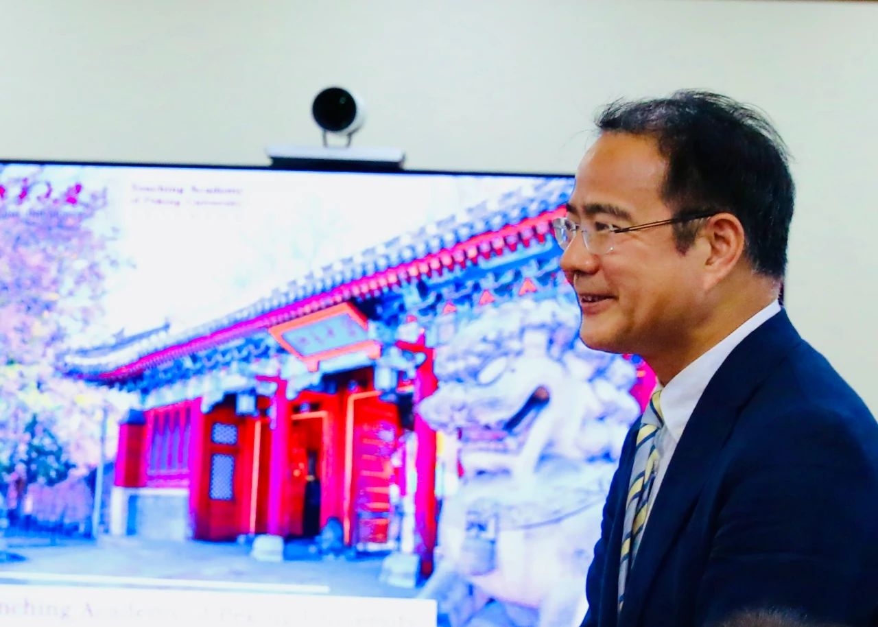 董强院长致欢迎辞。他表示非常高兴接待远道而来的各位基金会朋友。学堂自创立以来,在校内外各界支持和包括袁明教授在内的同仁共同努力下,探索出了一条独具特色的国际化办学道路,形成了良好的培养机制。以在座的刘国恩教授为代表的优秀教师,帮助学堂培养了一大批具有国际视野和中国情怀的优秀人才。从法国留学回到北大任教这二十多年来,董老师见证了北大的蓬勃发展。他认为一所好的大学应当吸收时代精华,汇聚顶尖的师资力量和优秀的生源,培养出能够应对未来世界复杂和不确定性的国际化人才,促进国家之间的深入交流。最后,董院长表示,当前国际高等教育事业遇到了新的挑战,我们也都在思考如何面对国内、国际的环境,接下来应该如何更好开展工作。燕京学堂尤其强调国际合作,也热切希望得到来自社会各界的支持。希望今天与基金会的会面,能够打开我们的视野,建立起良好的合作愿景。
