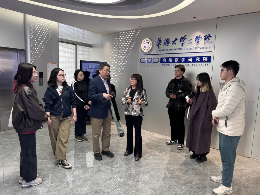 随后,师生们来到了华侨大学工学院科技创新中心、泉州数字研究院。讲解员从工学院的平台建设、设施设备、人才培养、成果转化和公共服务等方面进行了介绍。范士明副院长表示,对于文科学者来说,可以了解并参观工科学院的科研平台运用和产学研应用是很难得的经历。