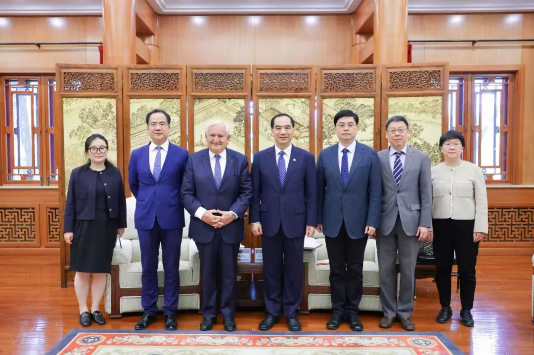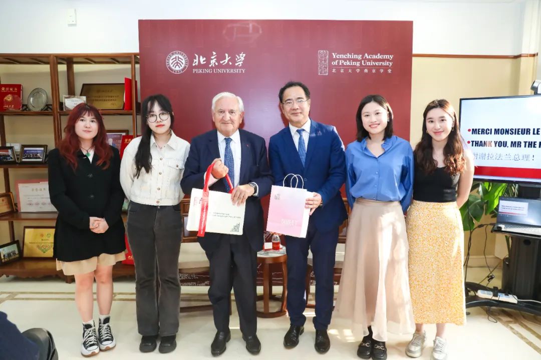 讲座开始前,北京大学校长龚旗煌在临湖轩会见了拉法兰先生,校党委常委、副校长方方陪同会见。