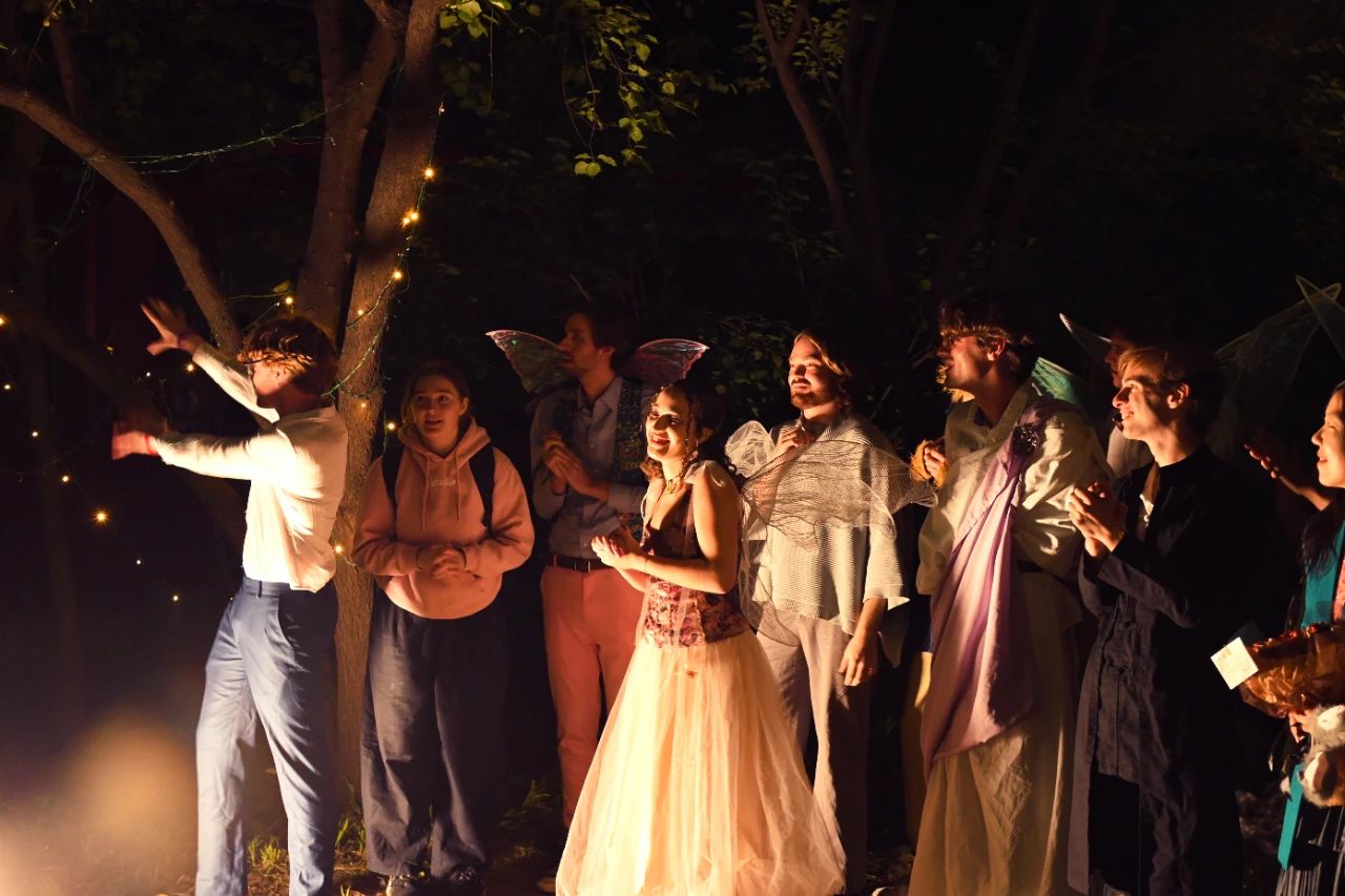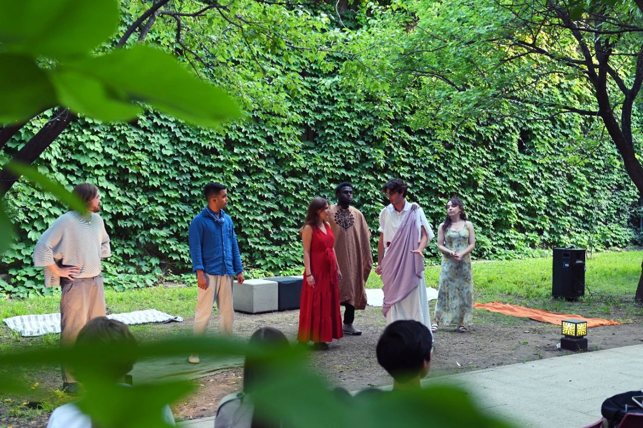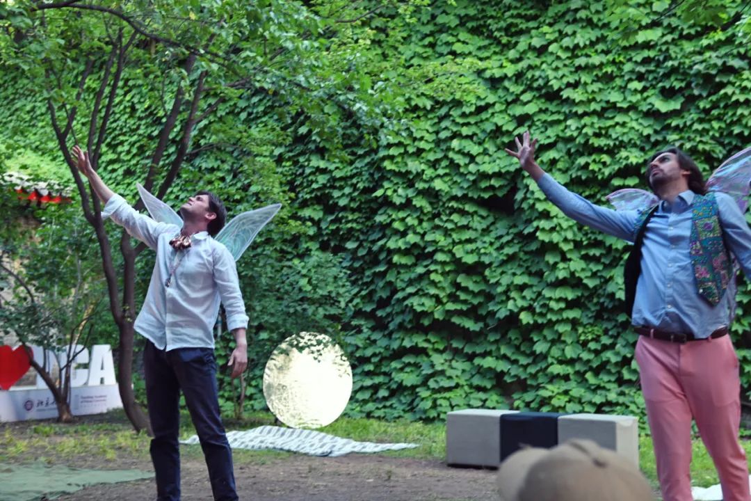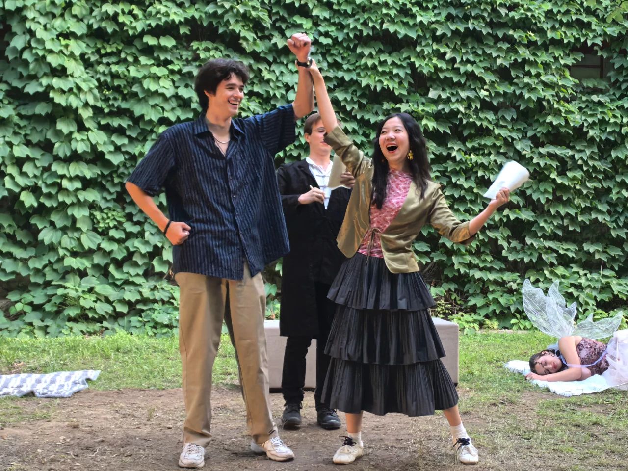 以草坪为舞台,以满院的爬山虎为背景,以自然的晦明变化为灯光,静园四院摇身一变,成了雅典森林的魔幻秘境。5月23日,一场由燕京学堂学生Luca Bustani Wood(英国)、Bella Gualano (英国)、Ioana Turcan (罗马尼亚) 联合执导,学生团队倾情演绎的莎士比亚话剧《仲夏夜之梦》,为艺术周正式拉开了帷幕,为观众带来了仲夏夜的专属记忆。