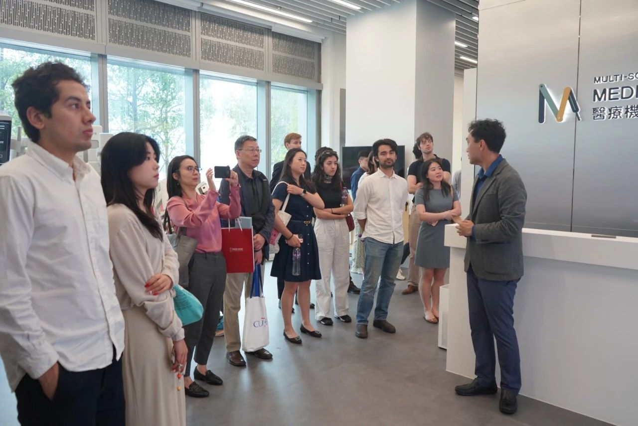 在香港科技园医疗机械人创新技术中心,同学们观看多尺度机械人执行复杂内脏器官手术视频演示,了解人工智能医疗的实际运用场景。Jayson Ding博士和他的科研团队不仅详细讲解了机械人辅助手术的完整流程,还邀请同学们亲手操作模拟医疗系统。指尖的细微动作即刻转化为虚拟屏幕上器械的精准位移,让同学们沉浸式体验人工智能为医疗赋能的无限可能。