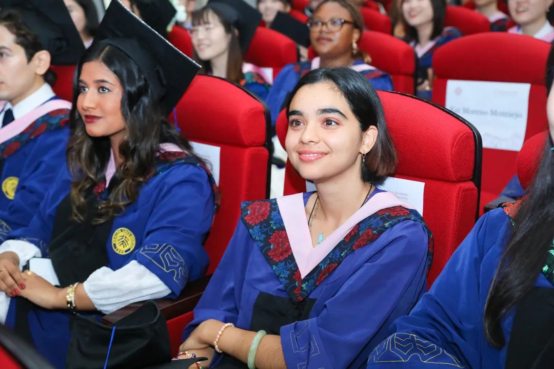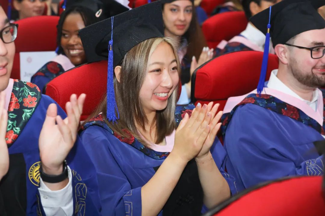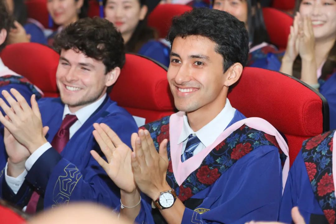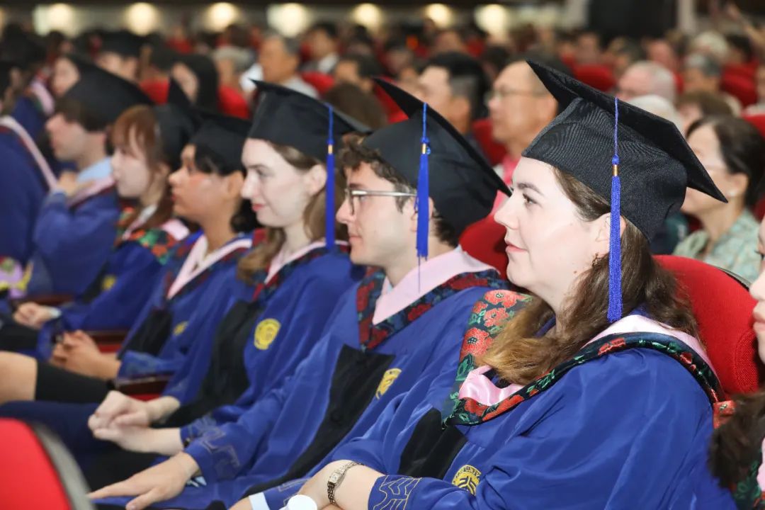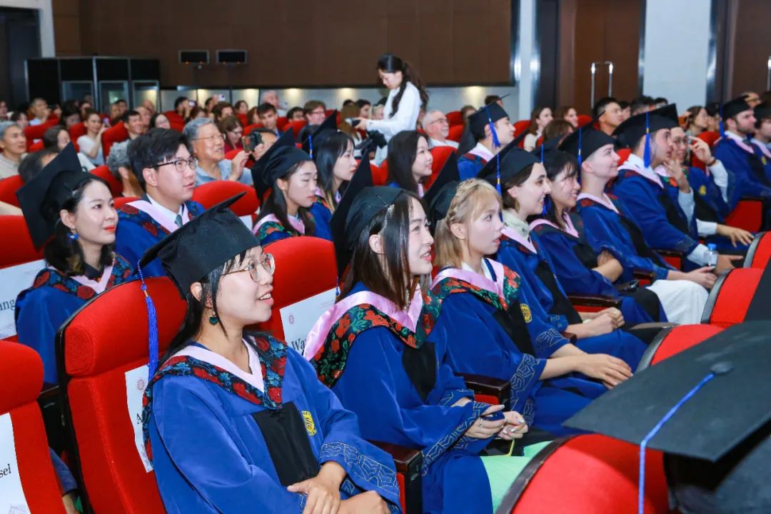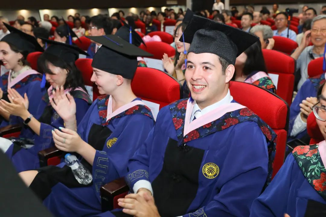两年前刚入学时大家共唱《甜蜜蜜》的中秋晚会瞬间仍历历在目,中国学生杨深深作为毕业生代表站在毕业典礼的讲台前,看着大家“甜蜜蜜“的脸庞,她分享了自己曾经的疑惑:“为什么要在中国,学习中国学?“