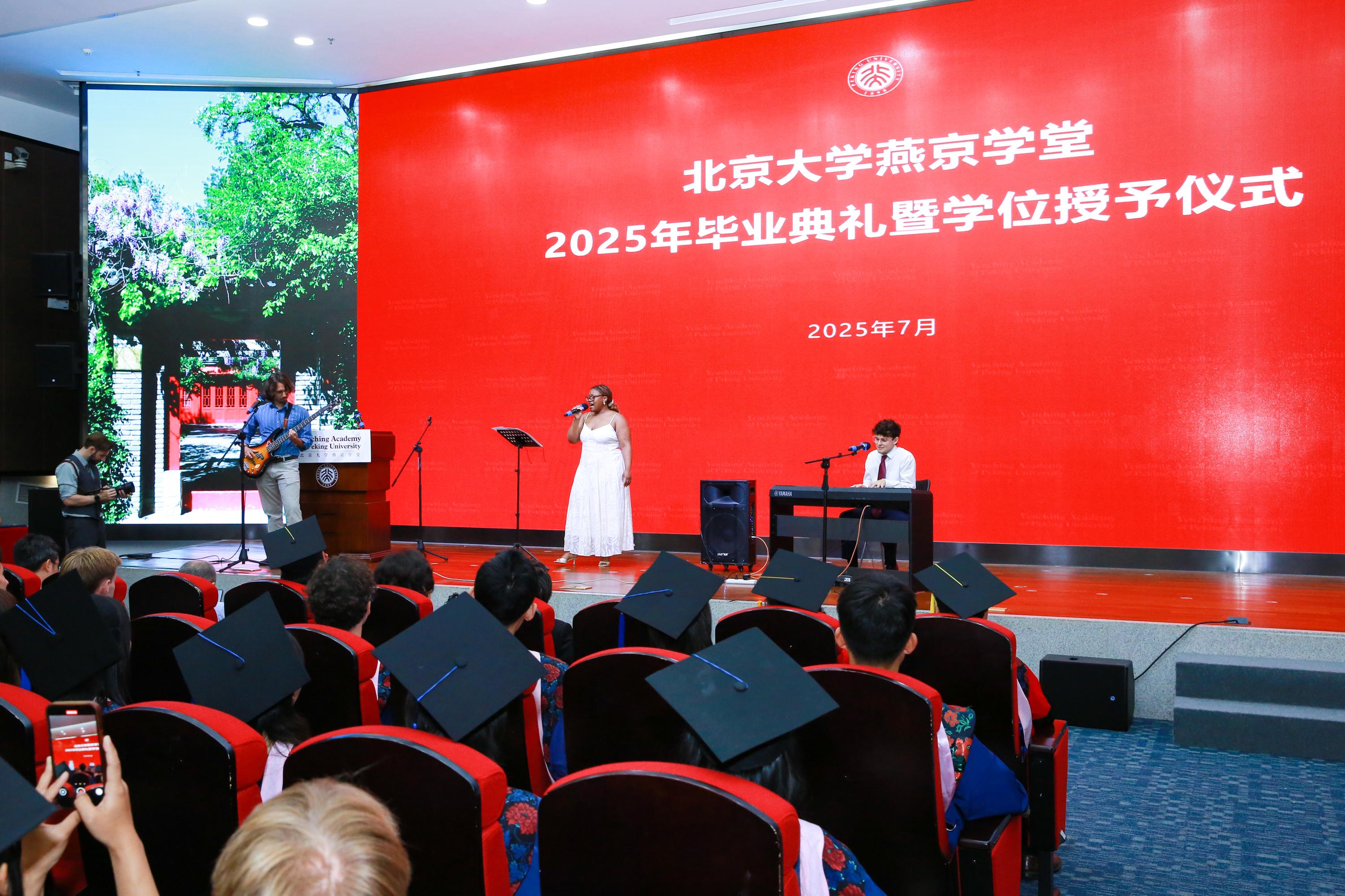 典礼接近尾声,毕业生Thandi Mtsetwene(南非)、Daniel Barbosa(巴西)、 Oliver Cutts(英国)组成的乐队带来了精彩的歌曲表演 Because You Loved Me 和《就是爱你》,点燃全场气氛。