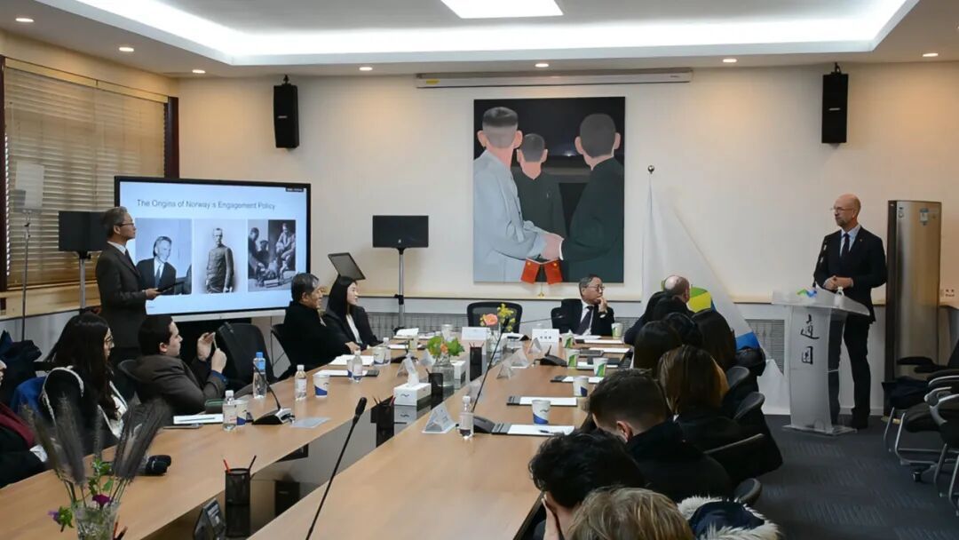 戴伟恩大使在演讲中系统阐述了挪威外交政策的三大支柱:与邻国关系、国际联盟合作及全球承诺。在论述与邻国关系时,他提出了“理解一国外交政策,必先理解其在地缘政治中的位置”这一深刻见解,并以此作为解读挪威外交理念的关键切入点。在此基础上,他进一步剖析了挪威在国际舞台上扮演的角色,特别是与欧盟、北约等主要国际组织的关系框架。