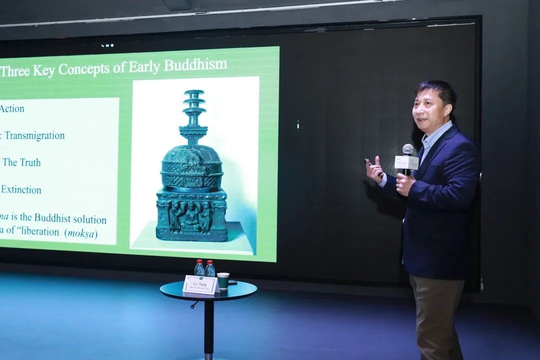 “阅见西湖”二楼的讲演厅里,陆扬为大家带来精彩的讲座。他从佛教的起源、关键信念讲起,延伸至佛教在中国的传播与发展,最终聚焦于杭州的佛教文化。从古印度到今天的杭州,佛教的影响穿梭千年,跨越万里,深嵌入这片土地的骨血间。