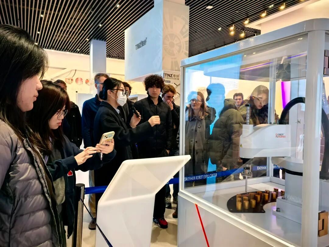 随后,第一组同学们参访了杭州凯尔达焊接机器人股份有限公司。该企业是一家专注于工业机器人及焊接设备研发、制造与销售的企业。在企业展厅与车间中,大家观摩了机器人在汽车、电子、家电等工业领域的高效应用,切身感受了其自动化水平。在与科研人员的交流环节,同学们踊跃提问。本次参访让同学们直观认识到机器人在推动制造业升级与新质生产力发展中的关键作用。