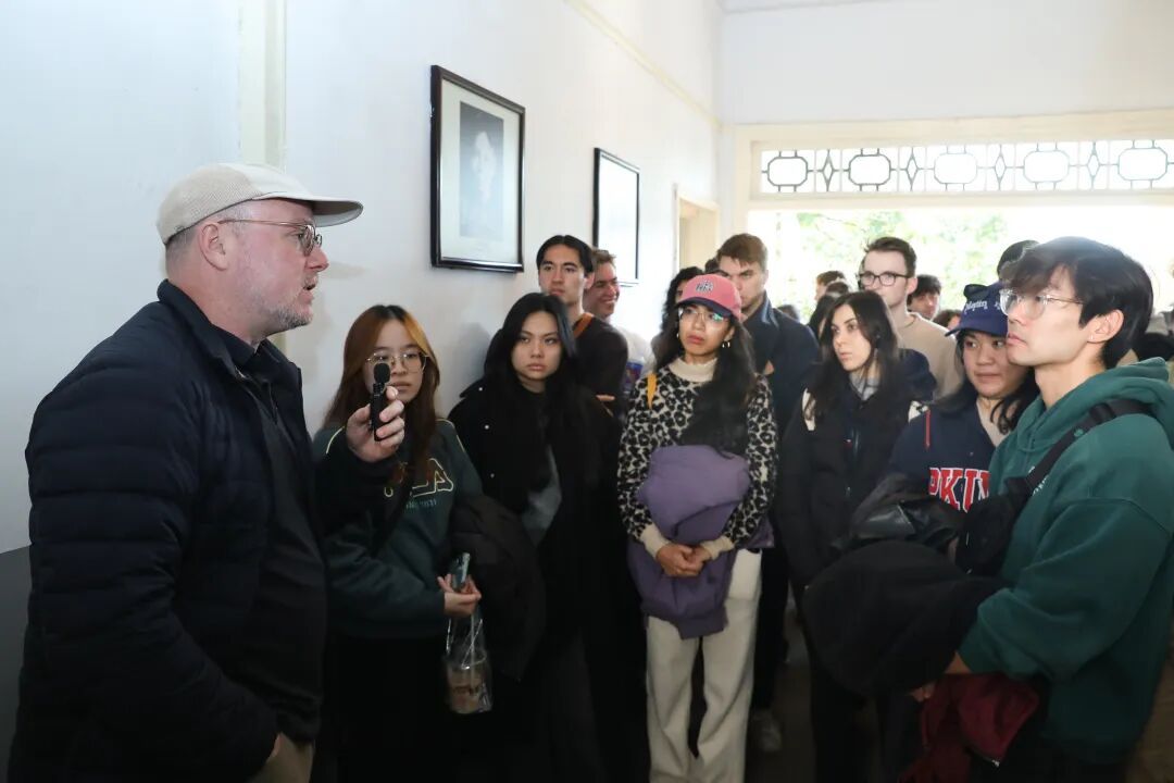 11月20日下午,师生一行抵达宁波溪口,参访蒋氏故居与雪窦山。在Brent Haas与陆扬的引领下,大家从武岭城门步入,依次经乐亭、小洋楼、玉泰盐铺等建筑,探访蒋介石与宋美龄的旧日居所,随后走访其创办的武岭学校、蒋氏宗祠与丰镐房,在建筑与场域间追溯那段风云激荡的民国岁月。老师从文化渊源切入,提及民国时期部分政治人物的思想理念受到不同传统哲学流派的浸润,为同学们理解政治人物的行为逻辑提供了思想史的维度。