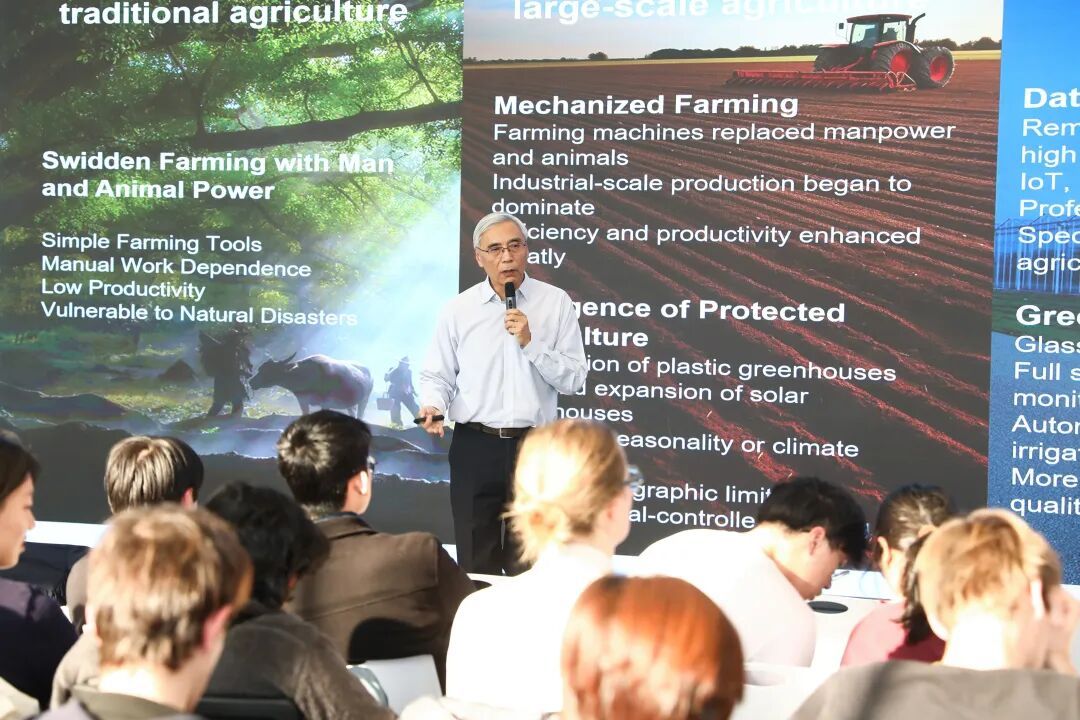 11月19日下午,全体同学来到四维生态科技(杭州)有限公司参访。四维生态 CEO 陈庆及其团队成员首先为大家带来一场深入浅出的讲座。随后,同学们走进其核心平台——数智植物工厂,实地观摩垂直立体种植、智能环境控制、人工植物光照与精准营养技术如何协同作用,使作物生长基本摆脱对自然环境与气候的依赖,实现全年稳定生产。据介绍,以生菜为例,该系统可实现生长周期缩短30%-50%,单位面积产出可达传统农业的50-100倍,显著缓解了食物安全与农业劳动力短缺的隐忧。这次参访让大家深刻认识到,科技农业不再是遥远的概念,而是保障未来粮食安全、实现可持续发展的切实路径。