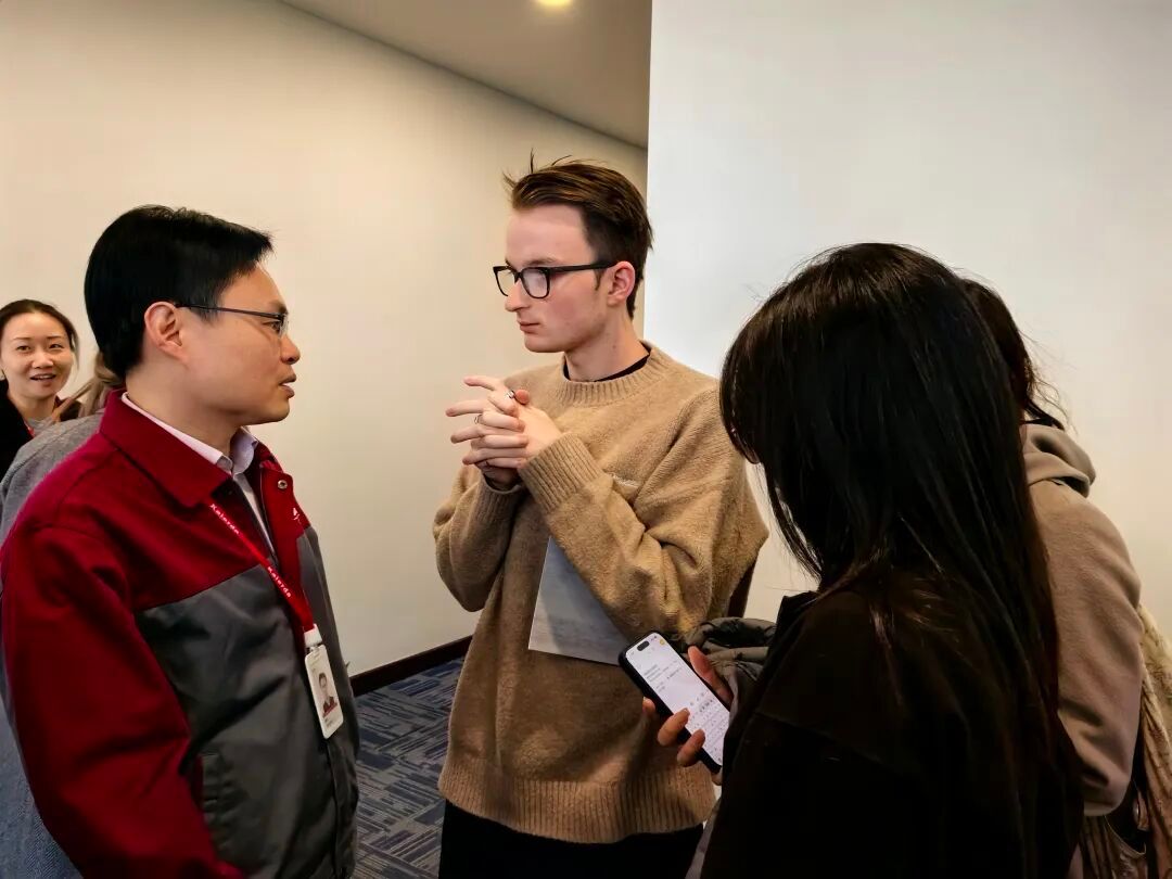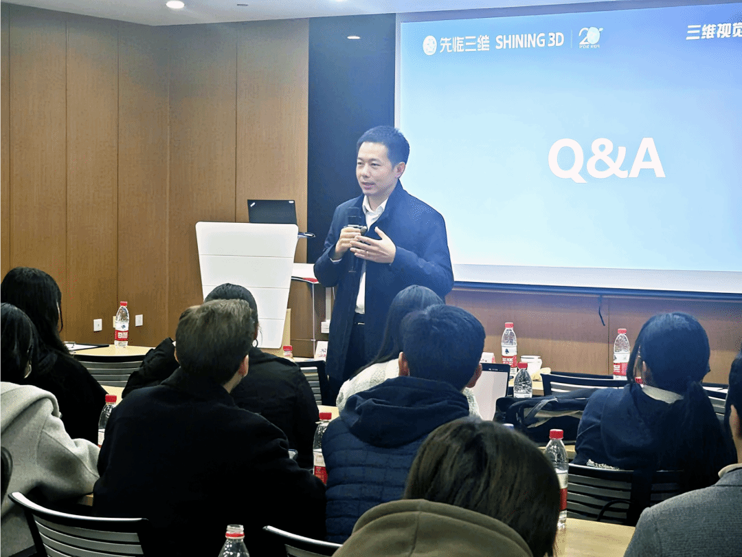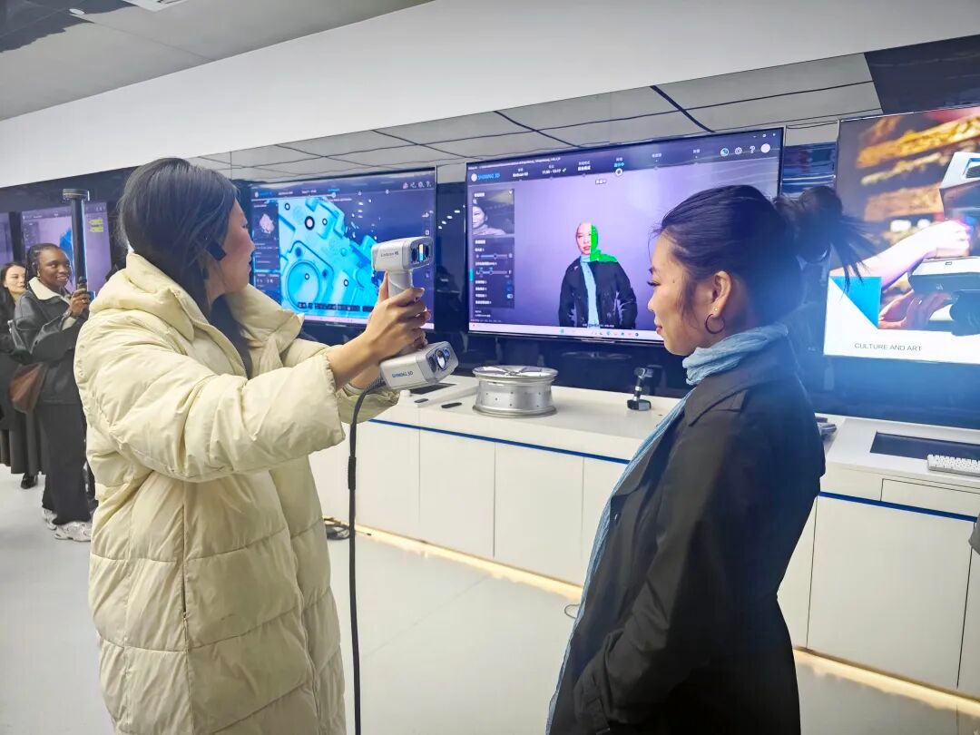 在先临三维科技股份有限公司,第二组同学们深入了解了高精度三维视觉技术,并观摩了从二维设计到三维实体模型的转化流程。通过公司样品间的展示,大家亲身体会到该技术在高端制造、医疗定制、文物保护以及影视娱乐等多个领域的实际应用,并近距离考察了相关的先进扫描设备与成型原型。在问答环节中,同学们就关注的技术研发的挑战、知识产权保护、全球化趋势及当地政府和企业的关系等议题,进行了深入互动。