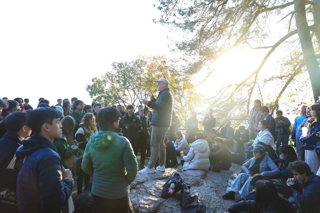 师生一行登临蒋介石曾下野隐居的雪窦山。在妙高台前,老师结合此地历史背景,进一步阐释中国近代政治的演变脉络,引导同学们思考时代背景与个人特质在历史进程中的交织作用。