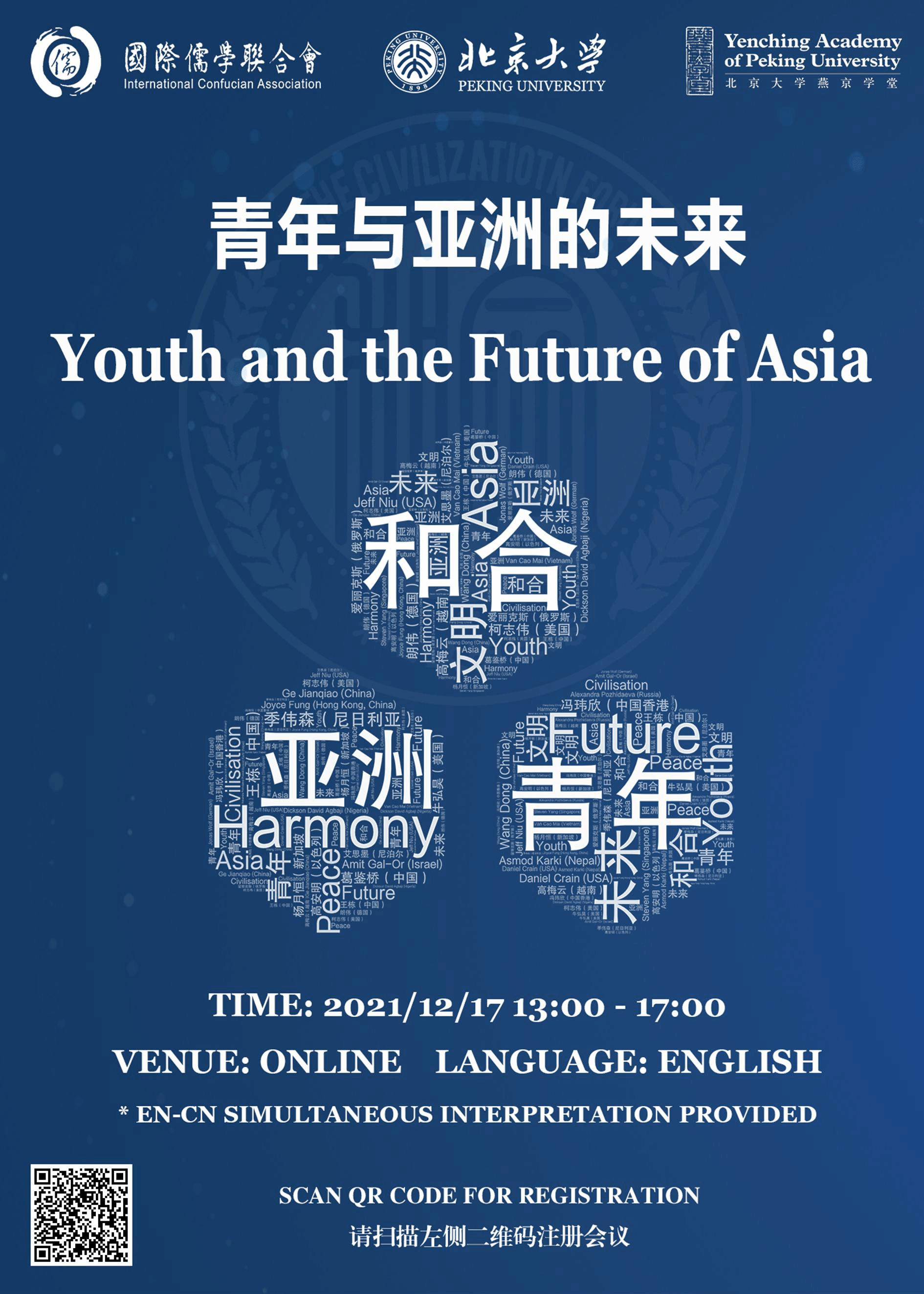 由国际儒学联合会主办、北京大学燕京学堂承办的“亚洲和合文明论坛·青年与亚洲的未来”将于12月17日在线上举行。论坛围绕“青年亚洲印记”和“青年创造未来”的主题,邀请了来自俄罗斯、德国、美国、尼泊尔、尼日利亚、新加坡、以色列、越南、中国等九个国家的嘉宾进行分享,探讨青年人在跨国实践中的合作、创新与担当。